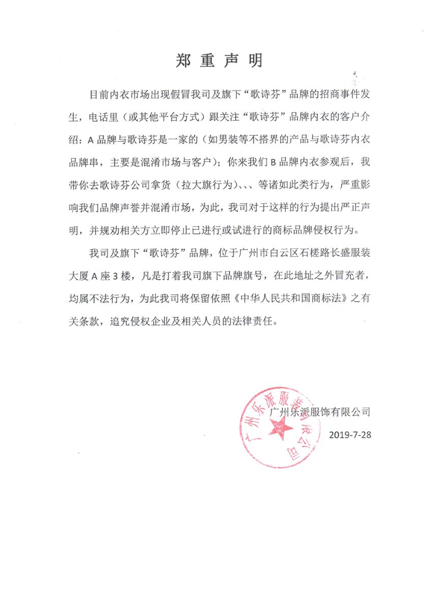 目前内衣市场出现假冒我司及旗下“歌诗芬”品牌的招商事件发生,电话里(或其他平台方式)跟关注“歌诗芬”品牌内衣的客户介绍:A品牌与歌诗芬是一家的(如男装等不搭界的产品与歌诗芬内衣品牌串,主要是混淆市场与客户);你来我们B品牌内衣参观后,我带你去歌诗芬公司拿货(拉大旗行为)、、、等诸如此类行为,严重影响我们品牌声誉并混淆市场,为此,我司对于这样的行为提出严正声明,并规劝相关方立即停止已进行或试进行的商标品牌侵权行为。